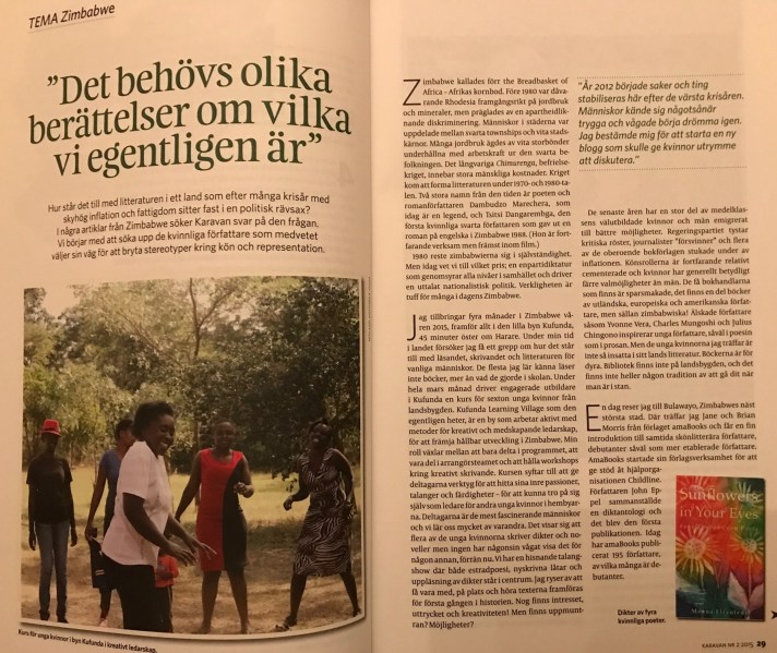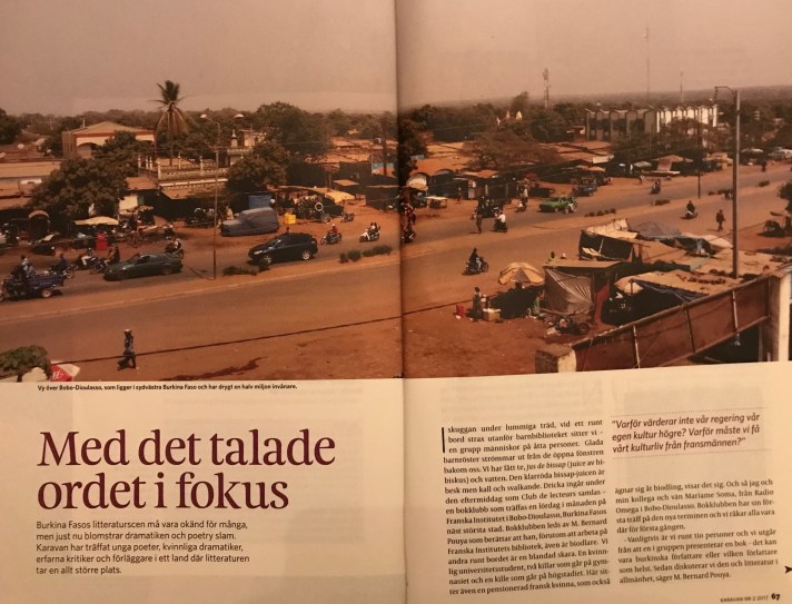 Fyra olika reportage om litteraturscenen inifrån i Zimbabwe. Intervjuer med unga författare, poeter, spoken-word artister och förläggare. Karavan # 2 2015.Reportage om litteraturscenen i Burkina Faso, samtal med författare, litteraturvetare, förläggare, poeter. #2, 2017.