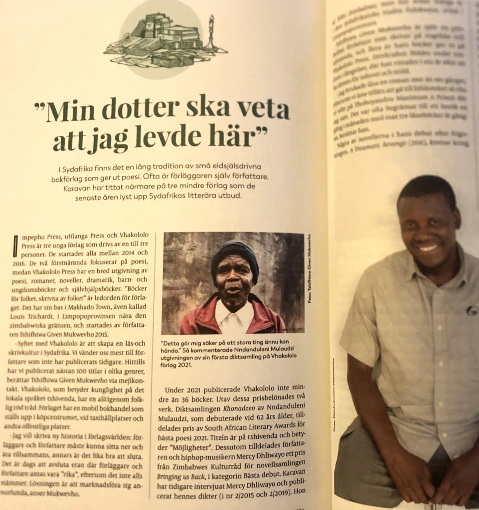 Reportage om tre förlag i Sydafrika där alla förläggare även är författare. Karavan # 2, 2022